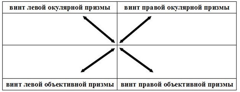 На каждой трубке, будет по два едва видных винта, каждый из которых имеет свое предназначение. Первые расположены сверху корпуса и отвечают за регулировку окулярной призмы. Вторые же находятся на внутренней части блока ближе к объективу и отвечают за настройку объективной призмы.